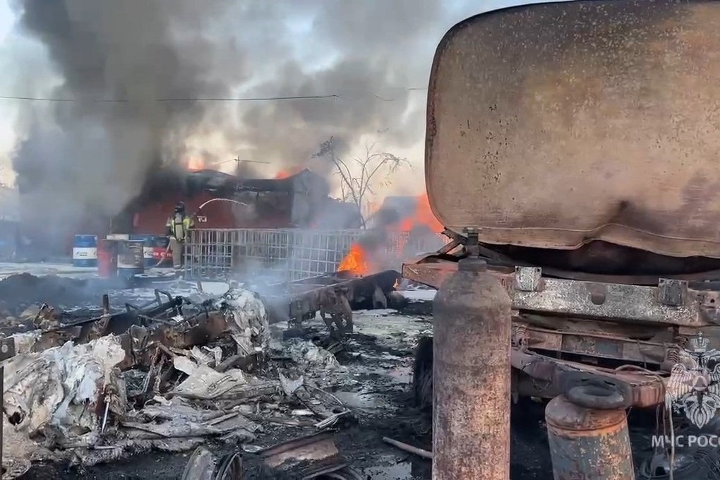 Прибывшие огнеборцы обнаружили, что на месте ЧП горят административное здание, бензовоз и два автомобиля. Общая площадь, охваченная огнем, составляет 500 кв. м.