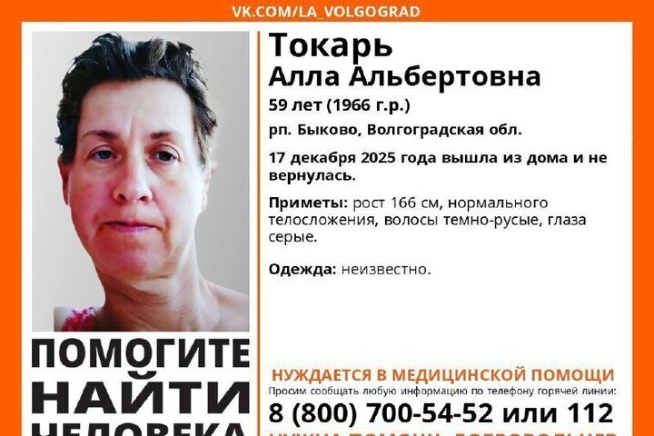 Алла Альбертовна Токарь 1966 года рождения проживает в рабочем поселке Быково Волгоградской области. 17 декабря она вышла из дома и не вернулась.