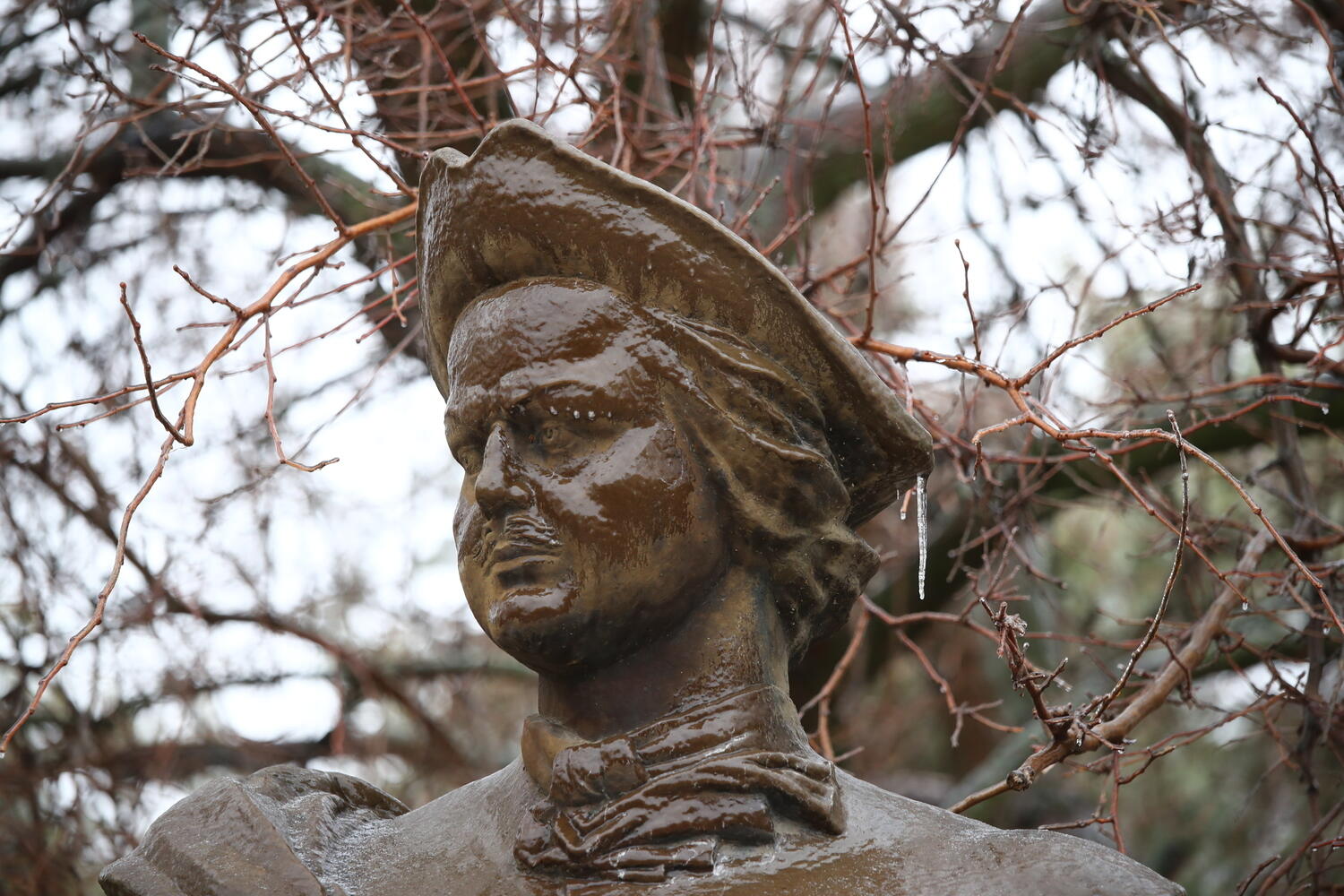 Из-за перепада температур в городе-герое статуи, автомобили и деревья сковал ледяной корсет. На дорогах наблюдается гололед.