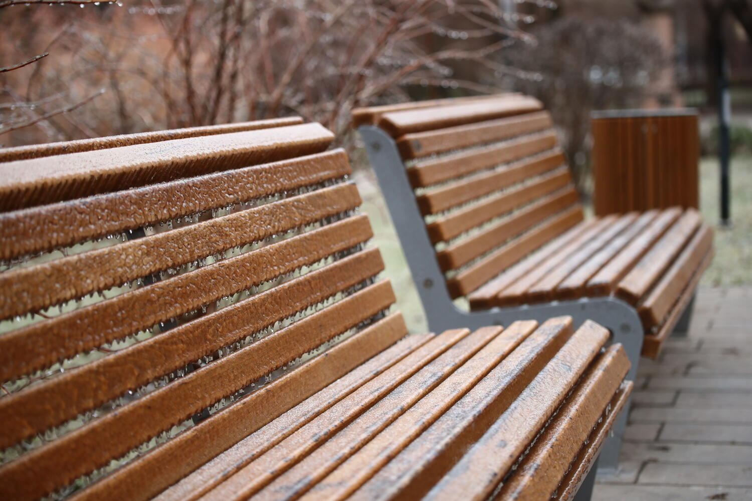После плюсовой погоды в Волгоград пришли холода. В сочетании со снегом и дождем мороз привел к образованию снежной корки на деревьях, статуях, скамейках и автомобилях.