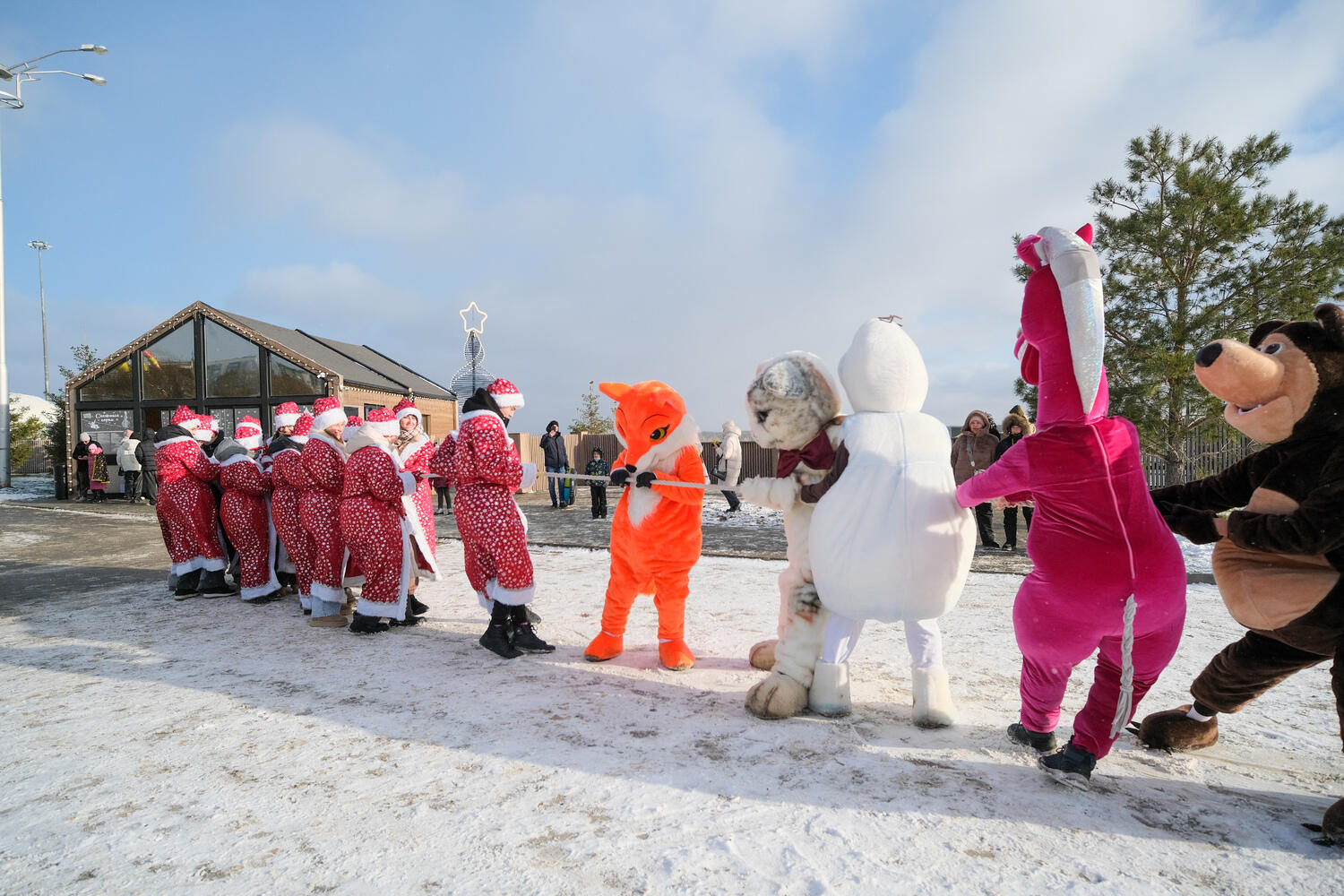 В середине дня на горку забрались первые посетители. На церемонии открытия детей и их родителей развлекали люди в костюмах Деда Мороза, Снеговика и других сказочных персонажей.