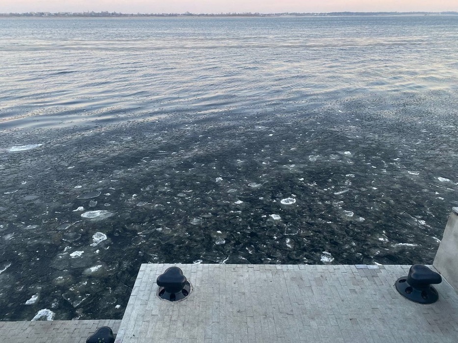 Такой лед называют блинчатым. Он образуется при околонулевой температуре. В это время верхний слой воды замерзает и под действием небольших волн разбивается на округлые фрагменты.