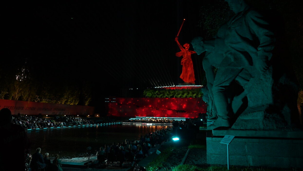 Сцена для музыкантов находилась на Площади Героев мемориального памятника-ансамбля на Мамаевом кургане. При этом зрители располагались по периметру огромного бассейна, символизирующего Волгу.