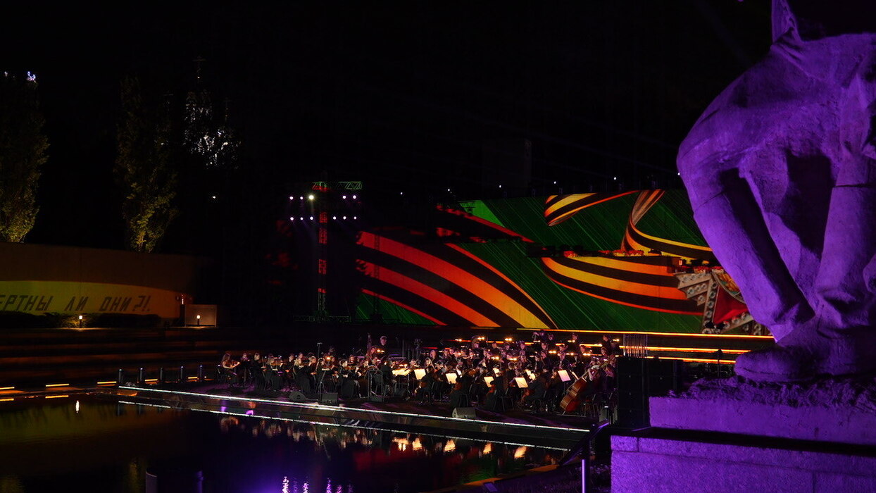 Сцена для музыкантов находилась на Площади Героев мемориального памятника-ансамбля на Мамаевом кургане. При этом зрители располагались по периметру огромного бассейна, символизирующего Волгу.