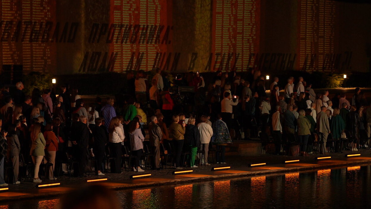 Сцена для музыкантов находилась на Площади Героев мемориального памятника-ансамбля на Мамаевом кургане. При этом зрители располагались по периметру огромного бассейна, символизирующего Волгу.
