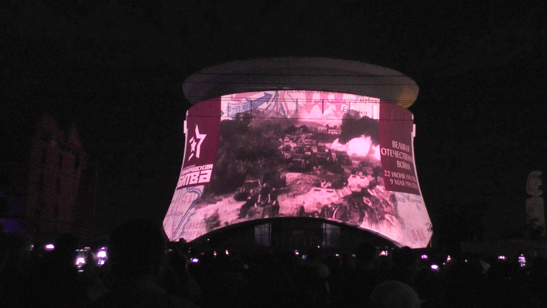 На главной высоте России показали ролики о городах-героях, а также хронику и сюжеты о наградах времен Великой Отечественной войны. «Свет Великой Победы» озарил и музей-панораму «Сталинградская битва». Здесь впервые показали полные изображения четырех крупнейших панорам страны – это «Бородинская битва», «Сталинградская битва», «Оборона Севастополя 1854–1855 гг.» и «Волочаевская битва».