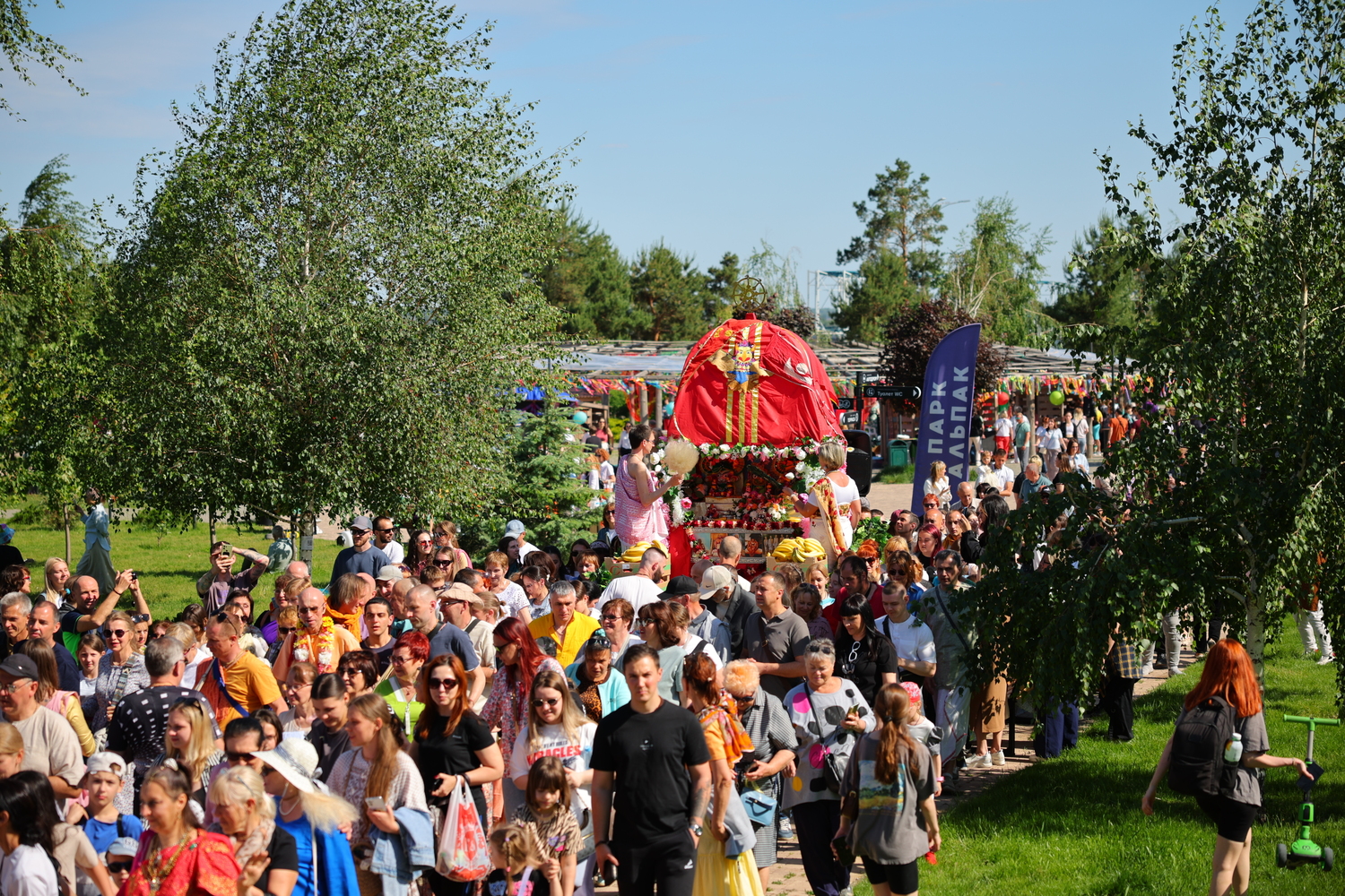 Торжества открыли шествие Ратха-Ятра – проездом 4-метровой колесницы по центральной аллее под ритмичные мантры и зажигательные индийские танцы. Каждый желающий мог к ней прикоснуться, загадать желание и угоститься экзотическими фруктами.