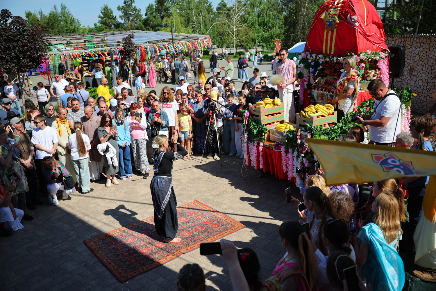Торжества открыли шествие Ратха-Ятра – проездом 4-метровой колесницы по центральной аллее под ритмичные мантры и зажигательные индийские танцы. Каждый желающий мог к ней прикоснуться, загадать желание и угоститься экзотическими фруктами.