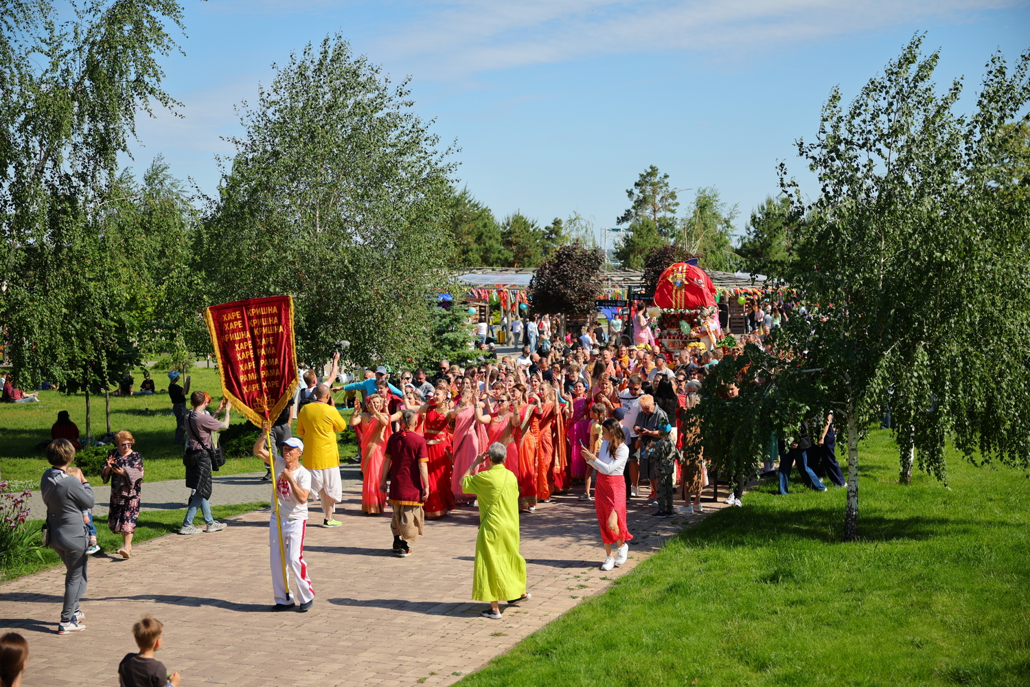 Торжества открыли шествие Ратха-Ятра – проездом 4-метровой колесницы по центральной аллее под ритмичные мантры и зажигательные индийские танцы. Каждый желающий мог к ней прикоснуться, загадать желание и угоститься экзотическими фруктами.