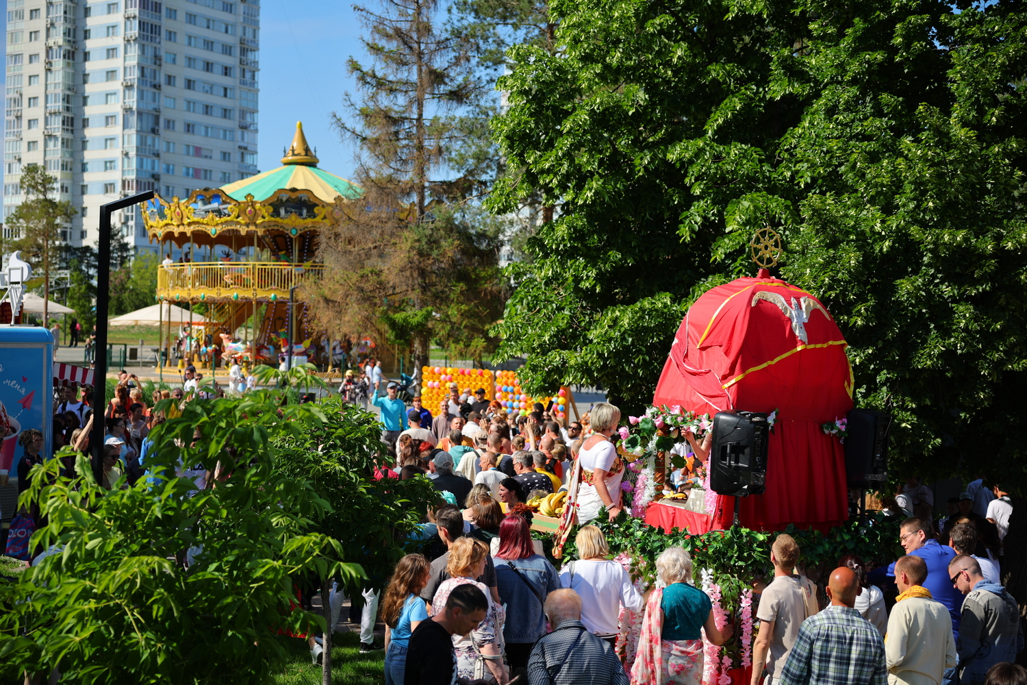 Торжества открыли шествие Ратха-Ятра – проездом 4-метровой колесницы по центральной аллее под ритмичные мантры и зажигательные индийские танцы. Каждый желающий мог к ней прикоснуться, загадать желание и угоститься экзотическими фруктами.