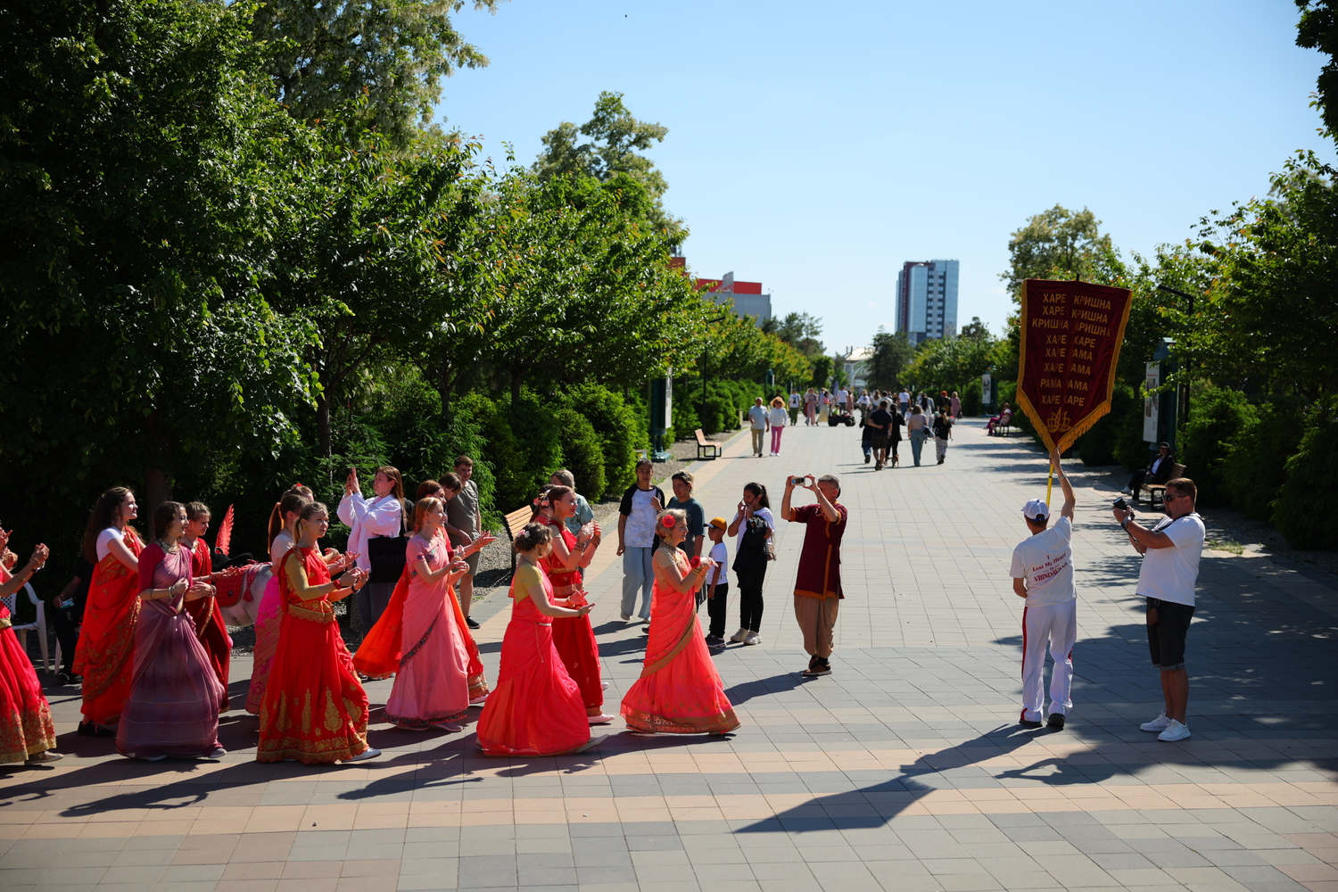 Торжества открыли шествие Ратха-Ятра – проездом 4-метровой колесницы по центральной аллее под ритмичные мантры и зажигательные индийские танцы. Каждый желающий мог к ней прикоснуться, загадать желание и угоститься экзотическими фруктами.