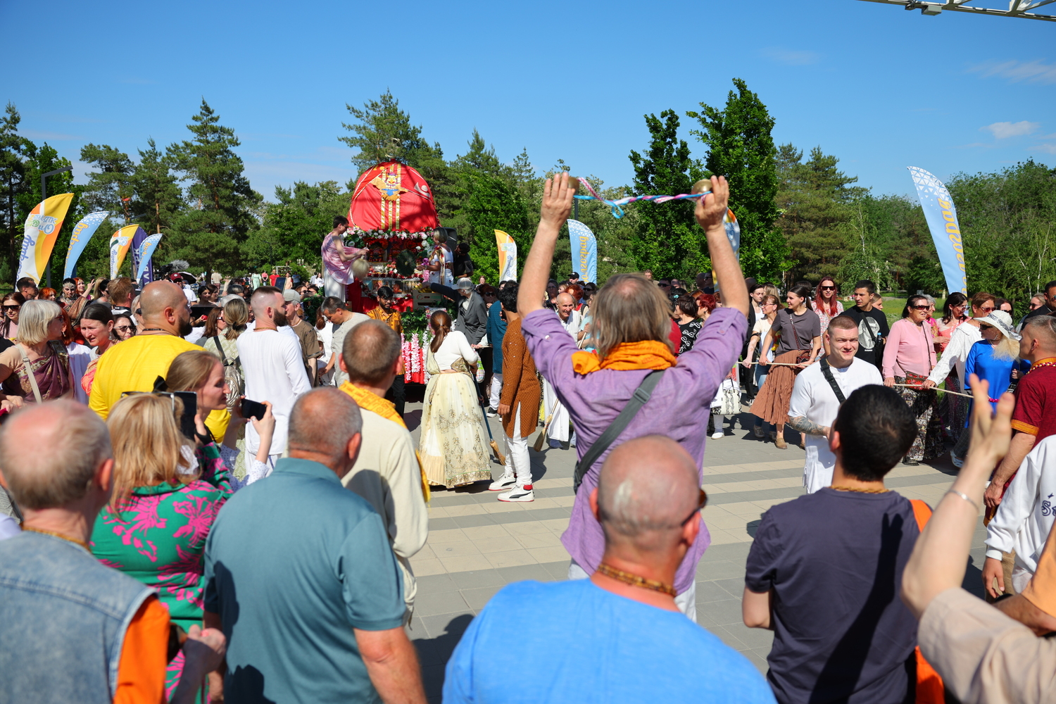 Торжества открыли шествие Ратха-Ятра – проездом 4-метровой колесницы по центральной аллее под ритмичные мантры и зажигательные индийские танцы. Каждый желающий мог к ней прикоснуться, загадать желание и угоститься экзотическими фруктами.
