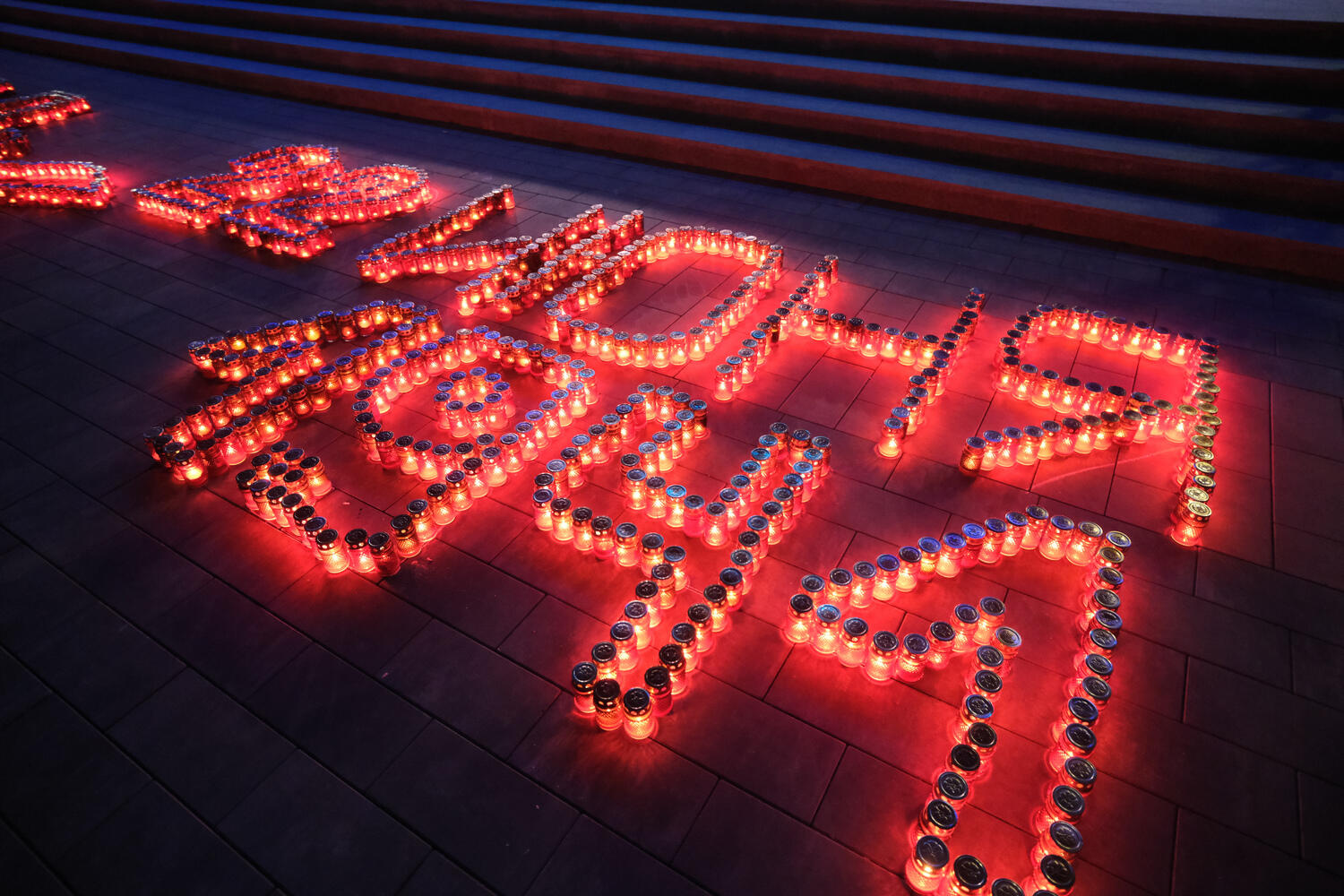 Участники всероссийской акции выложили у подножия мемориала надпись из зажженных свечей «Волгоград помнит 22 июня 1941».