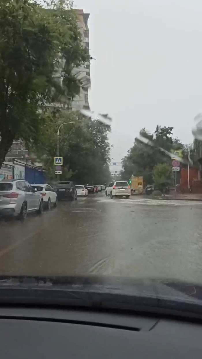 Все началось с раскатов грома и вспышек молний, после чего небо внезапно потемнело, поднялся сильный ветер, и на город обрушились потоки воды. Хотя дождь продолжался недолго, но успел основательно залить дороги.