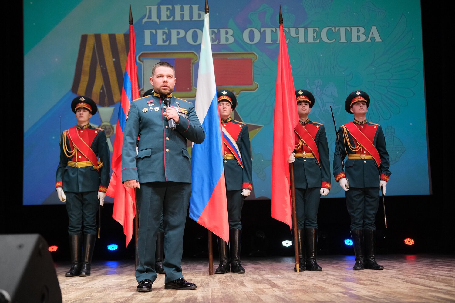 На торжественный концерт, посвященный Дню Героев Отечества, был приглашен заместитель командира штурмового полка майор Сергей Селиванов. Ровно год назад, 9 декабря 2024 года, он был удостоен звания Героя России.