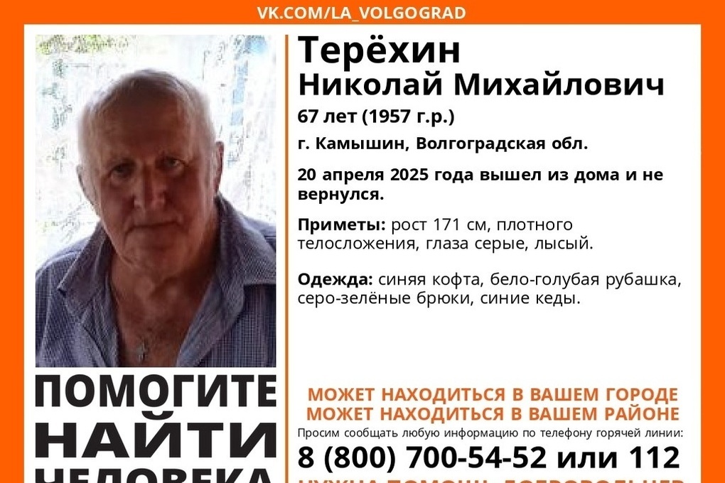 В Волгоградской области ищут Николая Терёхина, который бесследно исчез 20 апреля 2025 года. Пенсионер вышел из дома в городе Камышине и до сих пор не вернулся.