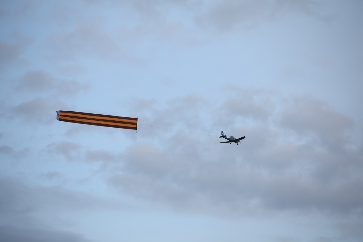 Вечером в пятницу, 2 мая, над Волгоградом пролетел легкий одномоторный двухместный самолет. К воздушному судну был прикреплен баннер шириной 3 метра и длиной 20 метров в виде георгиевской ленты, сообщает «Волгоградская правда.ру».