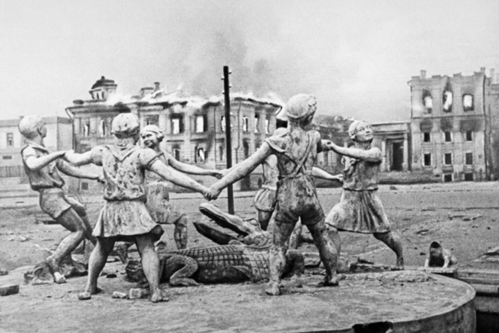 23 августа 1942 после бомбардировки города на Волге Эммануил Евзерихин сделал свой самый знаменитый снимок – «Сталинградский фонтан». Сцена, запечатленная на фотографии, стала символом разрушенного детства. Евзерихин снимал и другие фонтаны в годы Великой Отечественной войны, но сталинградскую серию отличает особая пронзительность.