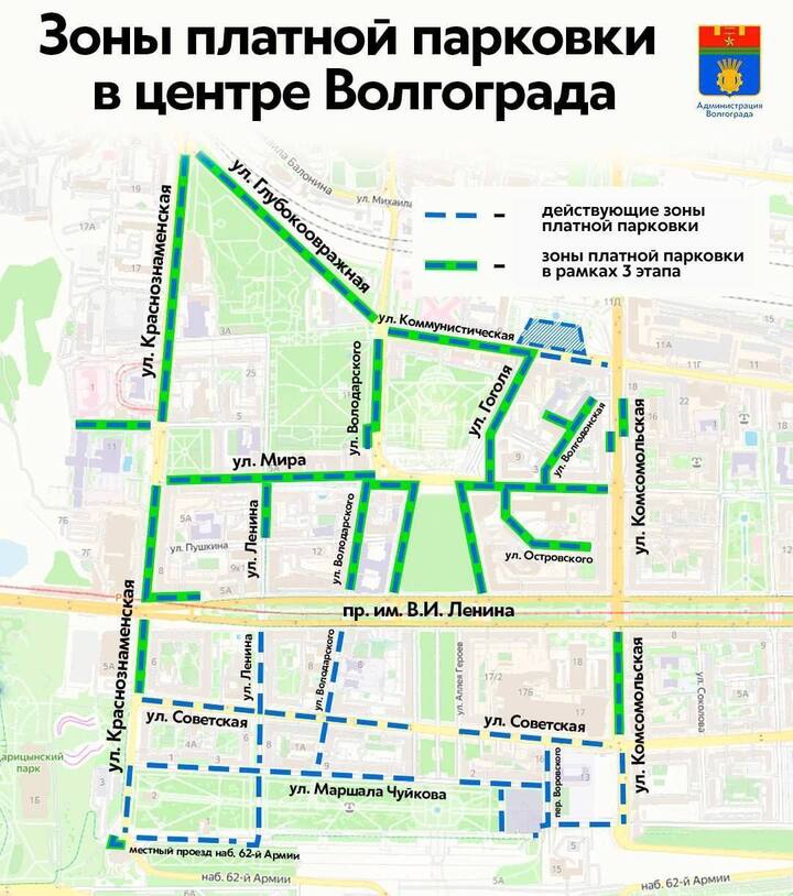 В рамках 3-го этапа зону платной парковки введут на ряде участков пр-кта им. В. И. Ленина, улиц Мира, 10-й Дивизии НКВД, Коммунистической, В. И. Ленина, Глубокоовражной, Краснознаменской, Набережной 62-й Армии (возле здания № 1а), Володарского, Гоголя, Островского, Волгодонской, Комсомольской и Аллеи Героев.