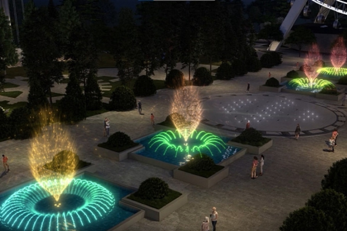 Также перед фонтанами планируется возведение амфитеатра на 5000 посадочных мест. Для создания естественных теневых зон по периметру объекта высадят крупномерные деревья.