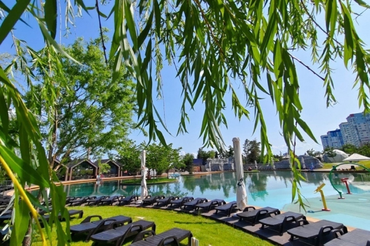 У бассейна установлены шезлонги, душевые, раздевалки, туалеты, навесы от солнца. Есть спрей-зона с фонтанами для малышей.
