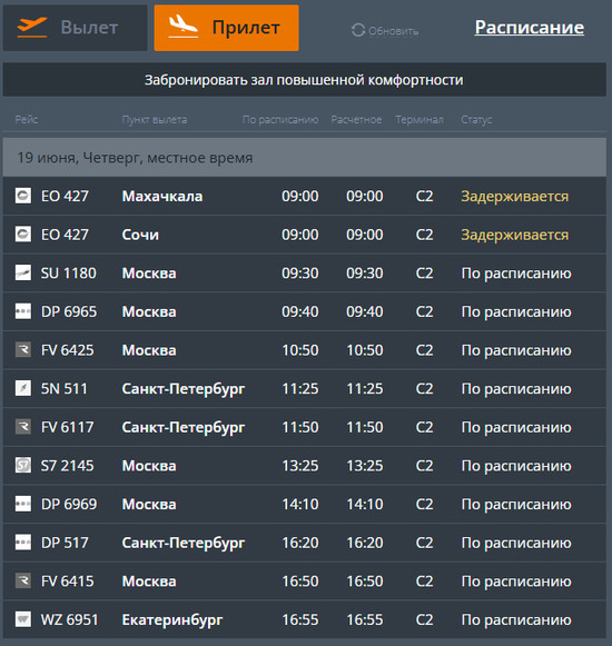 Вовремя не сможет вылететь самолет рейса SU 1185 до Москвы. Планируется, что он начнет полет в 7.45 вместо изначально запланированных 5.45. По данным на онлайн-табло, также в Волгоград задерживается прилет рейса EO 427 из Сочи.