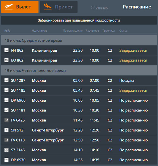 В Гумраке перенесли вылет рейса N4 862 до Калининграда. Лайнер должен был подняться в воздух 23.30 18 июня. Новое расчетное время – 10.00 19 июня.