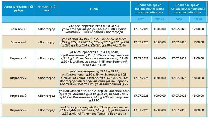 В четверг, 17 июля, в Кировском и Советском районах Волгограда на электросетях будут проводиться плановые профилактические работы. В связи с этим в некоторых домах перечисленных районов временно не будет света.