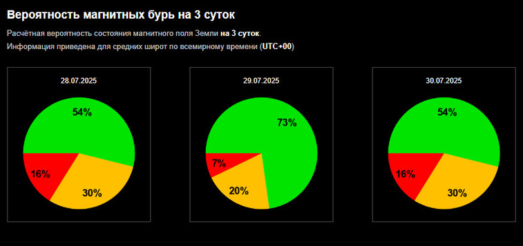 По информации, предоставленной лабораторией солнечной астрономии ИКИ и ИСЗФ РАН, вероятность возникновения магнитных бурь в понедельник, 28 июля, составляет 16%, а геомагнитных возмущений – 30%.