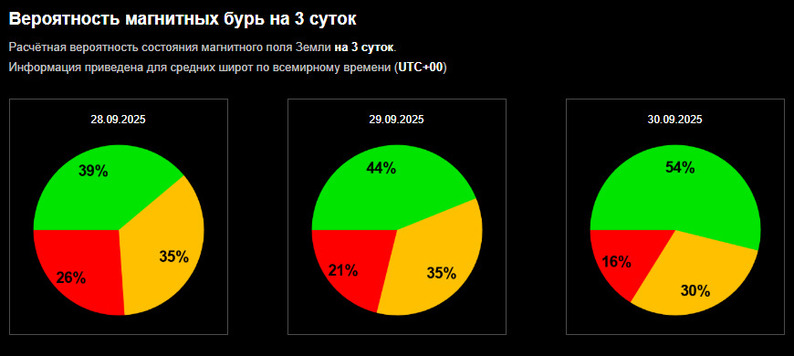 Вероятность магнитных бурь составляет 26%, а геомагнитных возмущений – 35%.