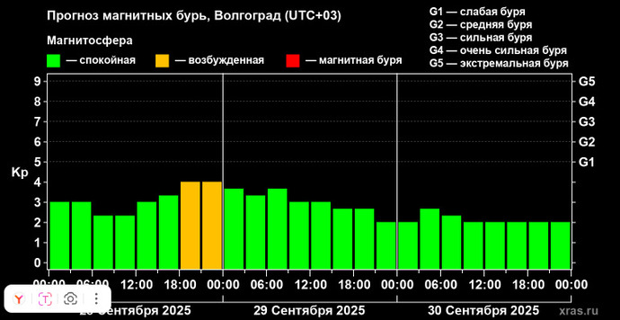 Тем не менее в воскресенье, 28 сентября, ожидается повышенная активность магнитного поля Земли. Согласно прогнозам ученых, сила возмущений достигнет уровня Kp-4.