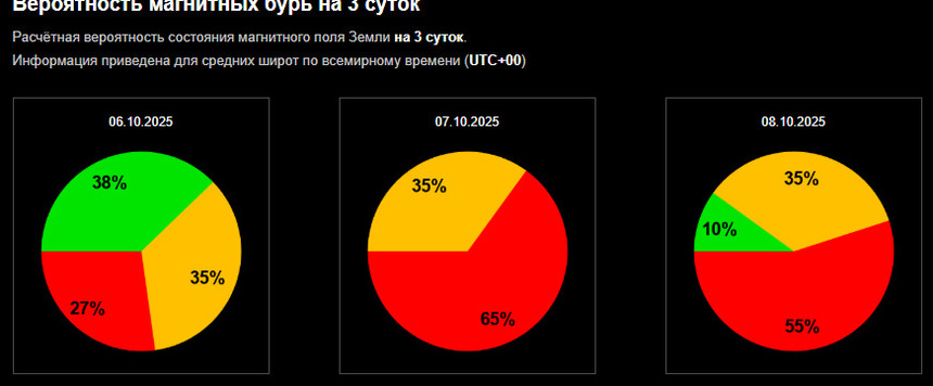 Впрочем, уже во вторник, 7 октября, ожидаются значительные изменения в геомагнитной обстановке. Так ночью на протяжении большей части дня Кр-индекс будет находиться в диапазоне от 2 до 4 баллов.