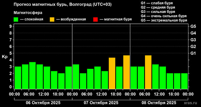Согласно данным Лаборатории солнечной астрономии ИКИ и ИСЗФ РАН, в понедельник, 6 октября, геомагнитный индекс Kp достигнет 4 баллов, что говорит об умеренно-возбужденном состоянии магнитосферы Земли.