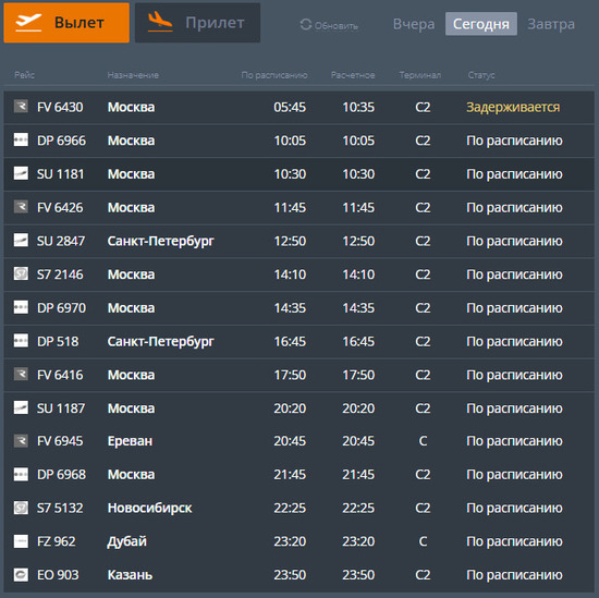 Согласно информации на онлайн-табло, время вылета в Москву одного лайнера также пришлось изменить. Самолет FV 6430 поднимется в воздух в 10.35 вместо 5.45.