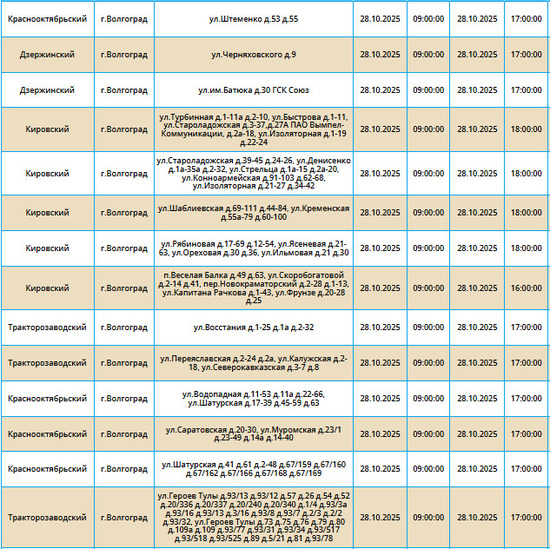 28 октября в 6 районах Волгограда приостановят подачу коммунальной услуги. Временные отключения света затронут множество улиц в Краснооктябрьском, Дзержинском, Тракторозаводском, Кировском, Ворошиловском и Красноармейском районах.