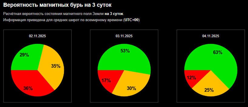 По прогнозу, вероятность геомагнитных возмущений в воскресенье составит 35%, а магнитной бури – 36%.