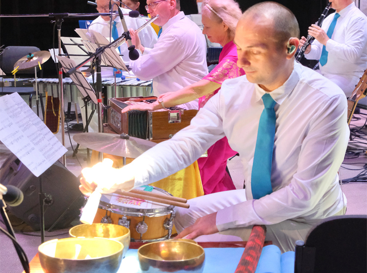 Восхищение вызвал и оригинальный подбор инструментов. На сцене были не только привычные ударная установка, скрипка, бас-гитара, акустическая гитара, электропиано, синтезатор, кларнет, металлофоны, флейта, баян, но и экзотические – поющие тибетские чаши, рейнстик, чаймс, непальский храмовый колокольчик, индийская фисгармония.