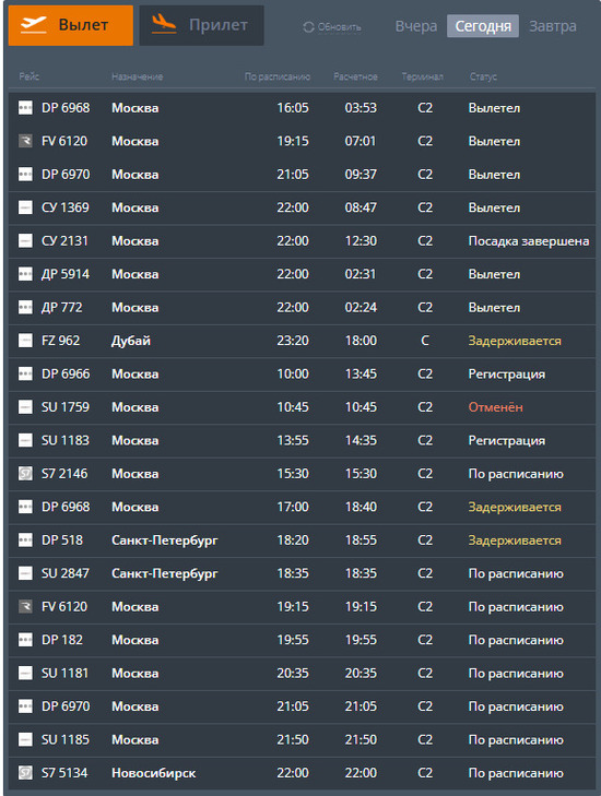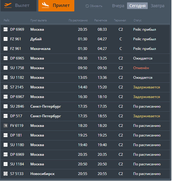 Что касается прилета самолетов в Волгоград, то в этом случае задерживаются два рейса из Москвы и один из Санкт-Петербурга. Так посадка S7 2145 ожидается в 15.20, вместо 14.40, а DP 6967 – в 18.10, вместо 16.30. Прибытие самолета из Питера (рейс DP 517) планируется в 18.55.
